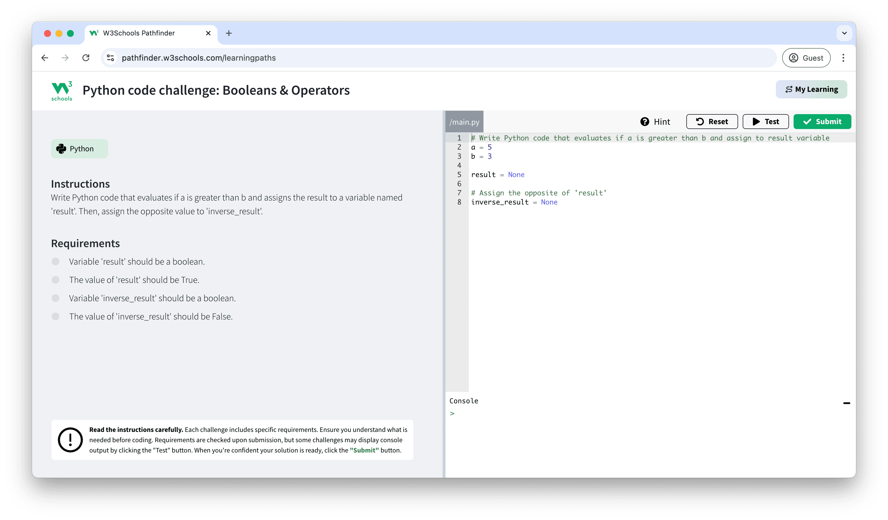 See an example of a Python Challenge with Booleans & Operators: