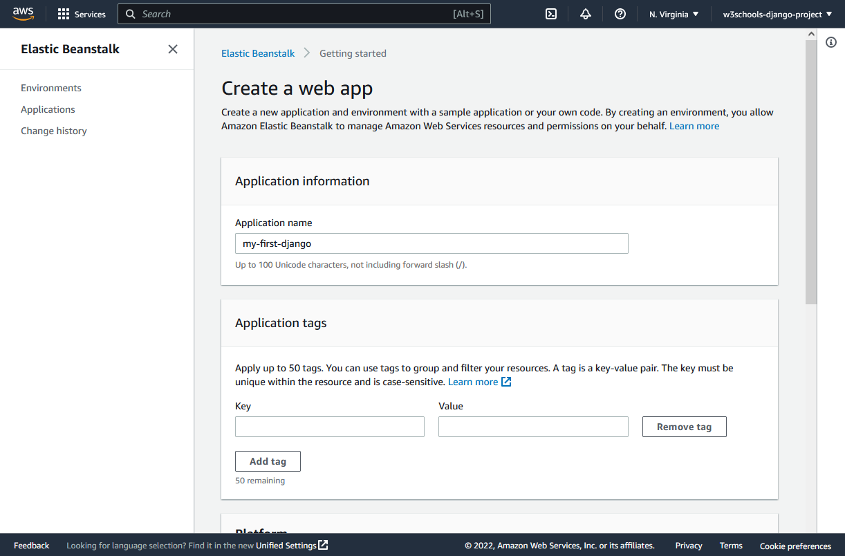 Once you have clicked the "Create Application" button, you will be taken to this page, where you can give your Django project a name. I will name it "my-first-django":