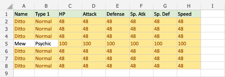 All of Ditto's stat values are 48 and all of Mew's stat values are 100, so they are all highlighted.