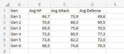 Let's see how the average stats add up across Pokemon generations