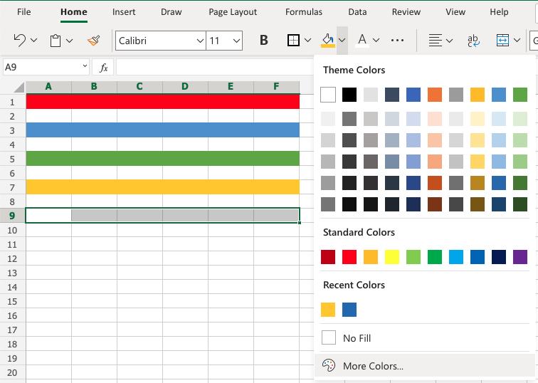Excel has a set of themes and standard colors available for use. You select a color by clicking it: