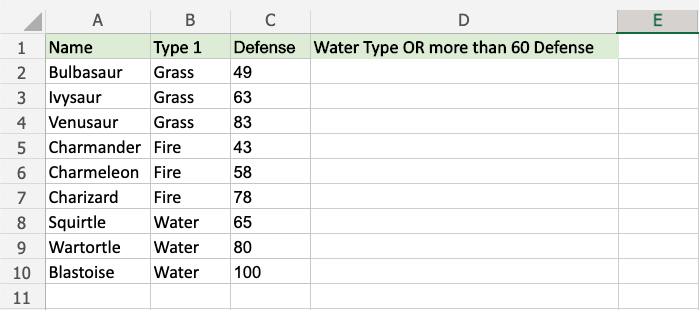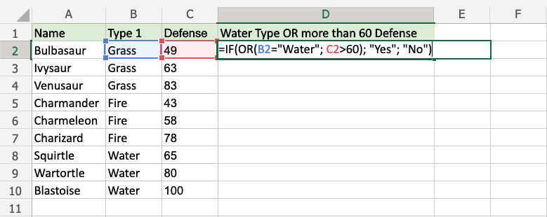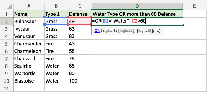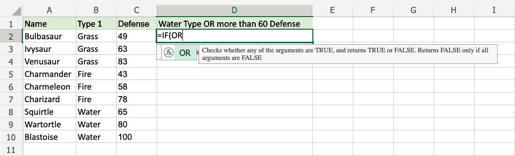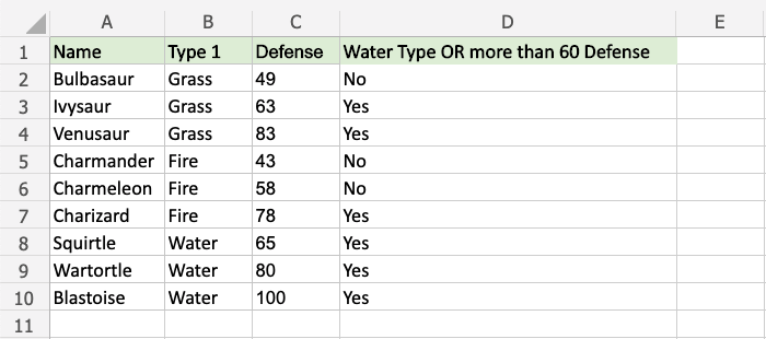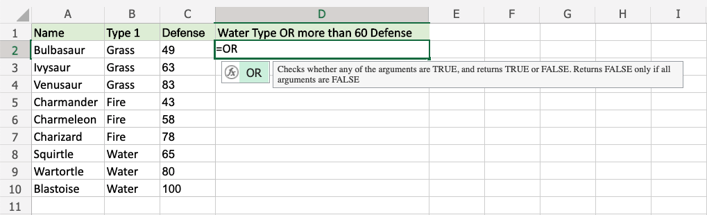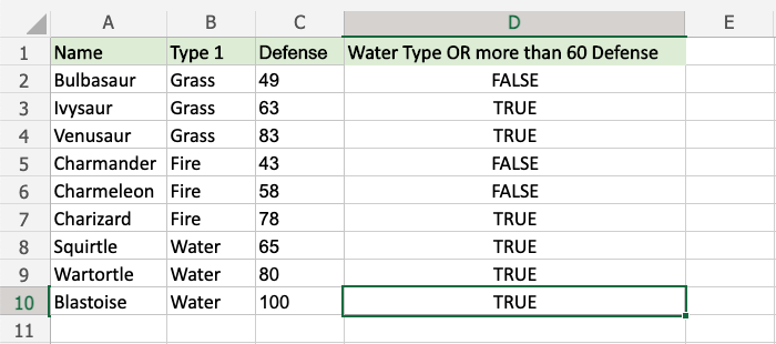 - Wartortle is both Water type and has more than 60 defense, so the function returns "TRUE"