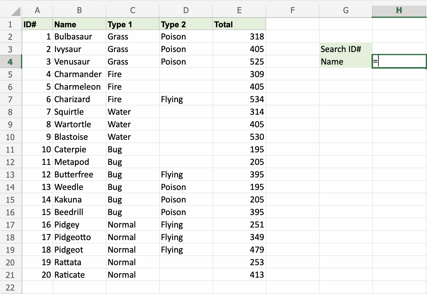 Use the VLOOKUP function to find the Pokemon names based on their ID#: