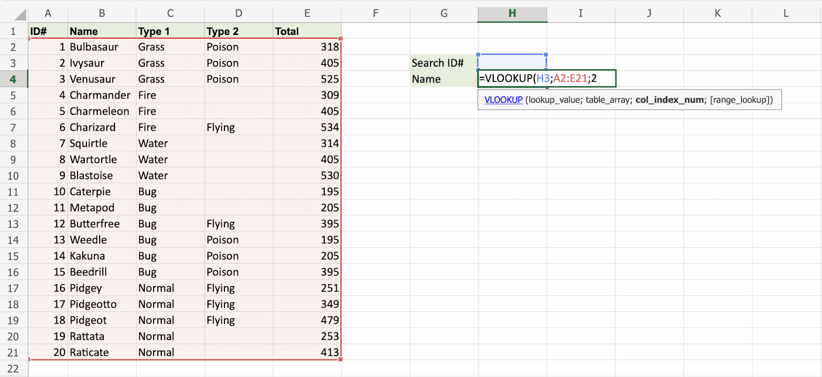 H3 selected as lookup_value. This is the cell where the search query is entered. In this case the Pokemons ID#.