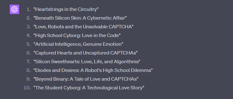 Suggest 10 titles for a short story about a robot posing as a student. It is written from a teenager's perspective, and the robot is almost a perfect copy of a human. They find friends and fall in love. But they still can't solve captchas when browsing the internet.
