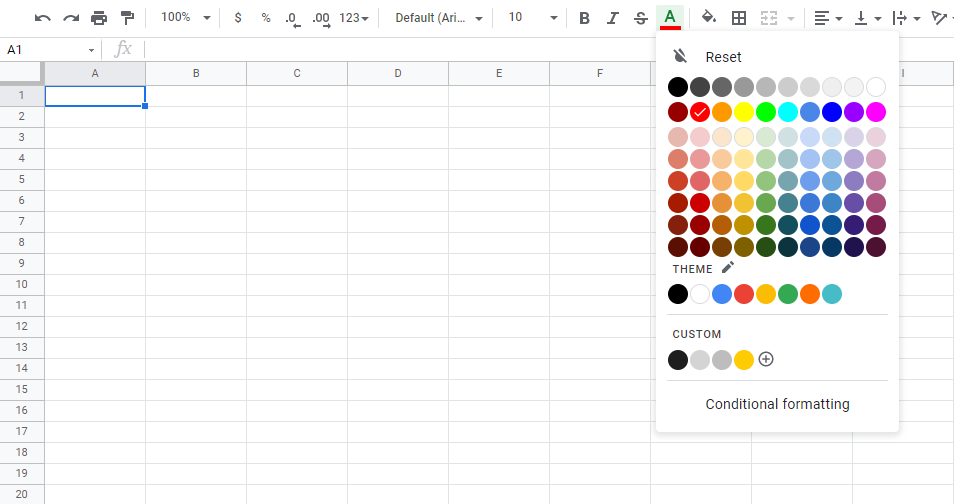 Note: Custom colors are applied in the same way for both cells and fonts. You can read more about it in the Apply colors to cells chapter.