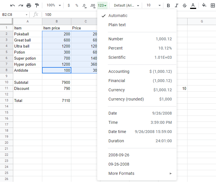 Note: The currency can be changed. For example instead of using $ like in the example you can decide for NOK or EUR. It is changed in the dropdrop menu, clicking the More Formats in the bottom of the menu. Then, clicking on More Currencies.