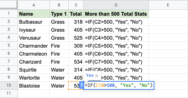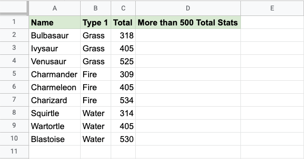 The function can be repeated with the filling function for each row to perform the same check for each Pokemon: