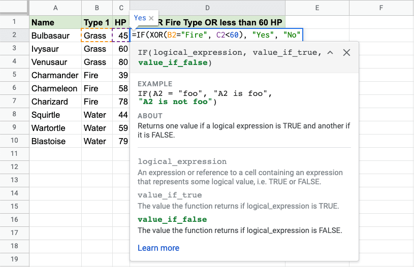 - Wartortle is not Fire type, but has less than 60 defense, so the function returns "TRUE"