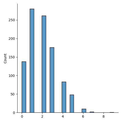 sns.displot(random.poisson(lam=2, size=1000))