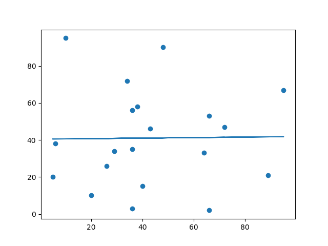 The result: 0.013 indicates a very bad relationship, and tells us that this data set is not suitable for linear regression.