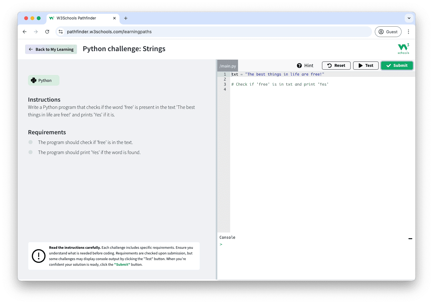 Python is best learned by doing, and this is why we have included a lot of challenges in the course.