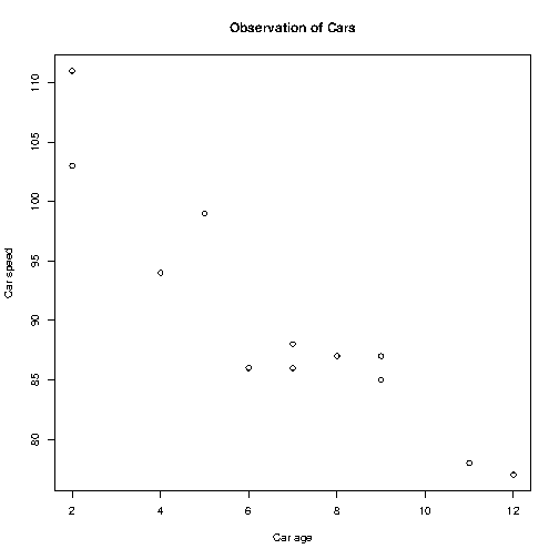 main="Observation of Cars", xlab="Car age", ylab="Car speed", col="red",