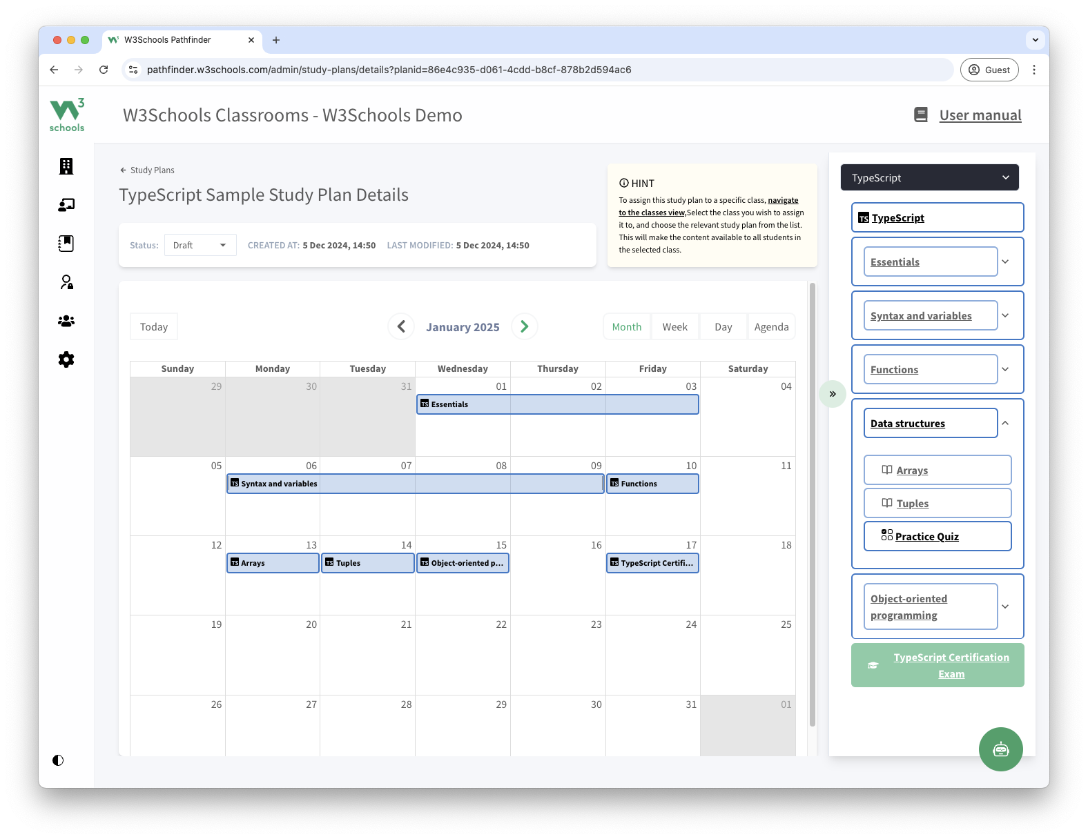 Save time with pre-built teacher materials and study plans. Easily organize your class with a timeline from the introduction of TypeScript to the final exam.